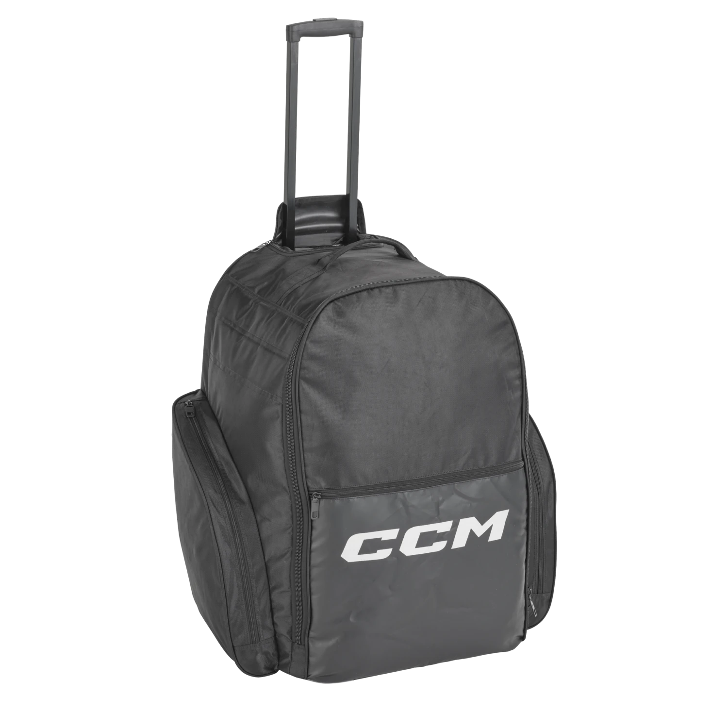 The CCM 490 Wheel Backpack Bag is the ideal choice for wheeling or carrying your equipment. It is made of heavy-duty water-resistant pro tarpaulin and 840D ripstop polyester with tarpaulin fabric reinforcement on the bottom. It has two padded and reinforced backpack straps with a stick holder slot, plus a main compartment with skate pockets and an accessory pocket at the front. All-terrain wheels make it easy to transport your gear.